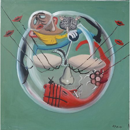 Wie surreal die Erkrankungen nicht nur auf gesunde Menschen wirken, sondern auch für die Betroffenen selber, wurde uns nicht nur durch die Lektüre von Lehrbüchern klar, sondern auch durch die Kunst von psychotischen Patienten. Uns beeindruckte und inspirierte vor allem die Serie von Selbstporträts eines schizophrenen Patienten namens Bryan Charnley (The Self Portrait Series). Seine Gemälde fanden zu Lebzeiten wenig Anklang in der Kunstwelt. Um seiner Krankheit ein Gesicht zu geben, variierte er in einem Selbstversuch täglich die Dosis seiner antipsychotischen Medikation und führte dabei ein Tagebuch und fertige Selbstportraits an. Sie sind ein beeindruckendes Zeugnis seiner Zerrissenheit und seines Leidens. Auszug aus seiner Beschreibung von Porträt 9: “... the nail in the mouth expresses my social ineptitude and an inability to socialise which makes me a target.”